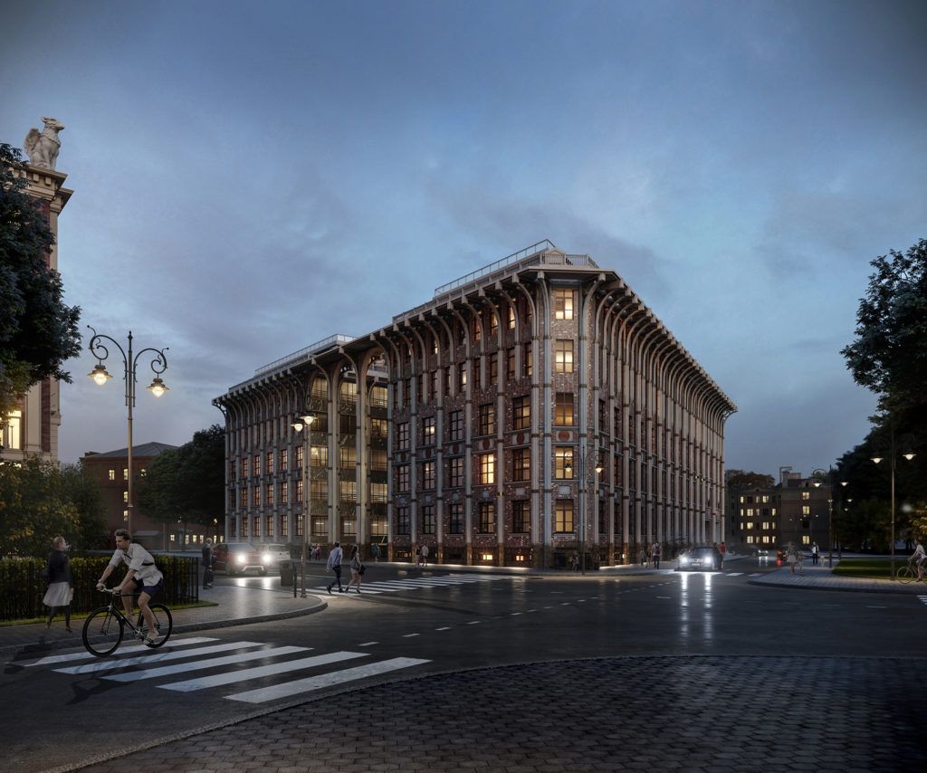 Сочетание различных стилей привело к оригинальному внешнему воплощению. Клубный дом соединил в себе наиболее яркие архитектурные элементы и сохранил качество уровня de luxe. В строительстве фасада используются мраморезированный известняк и клинкерный кирпич, инженерные сети конструируются с учетом современных технологий. Клубный дом издалека привлекает внимание величественным фасадом.